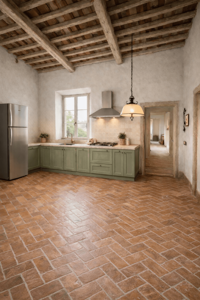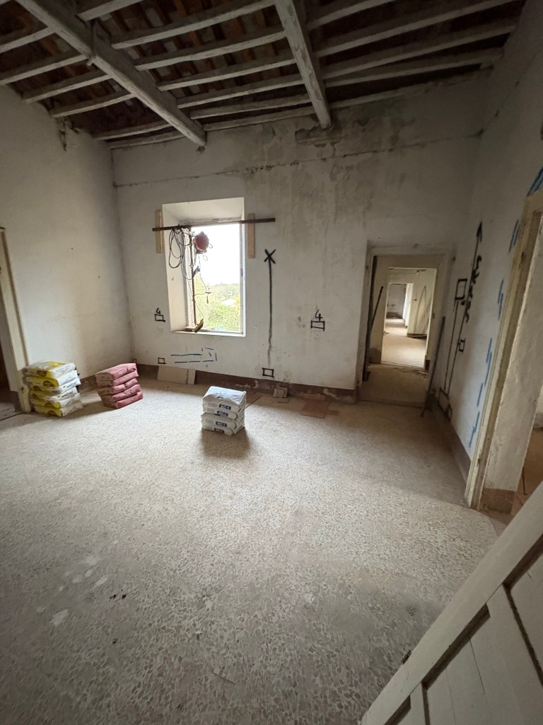 Questa è Casa Istrice, siamo nella futura cucina ed abbiamo creato questa immagine per farti rendere conto lo stile che avrà il tuo appartamento, Toscano a tutti gli effetti con un soffitto a travi e mezzane e pavimento in grès porcellanato stile cotto.